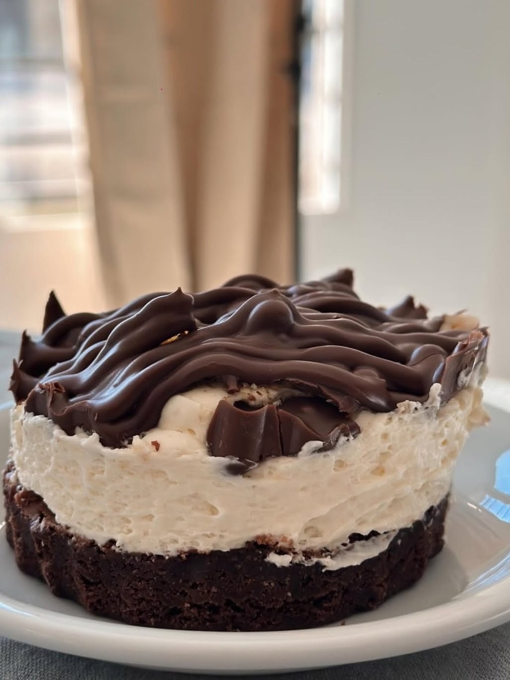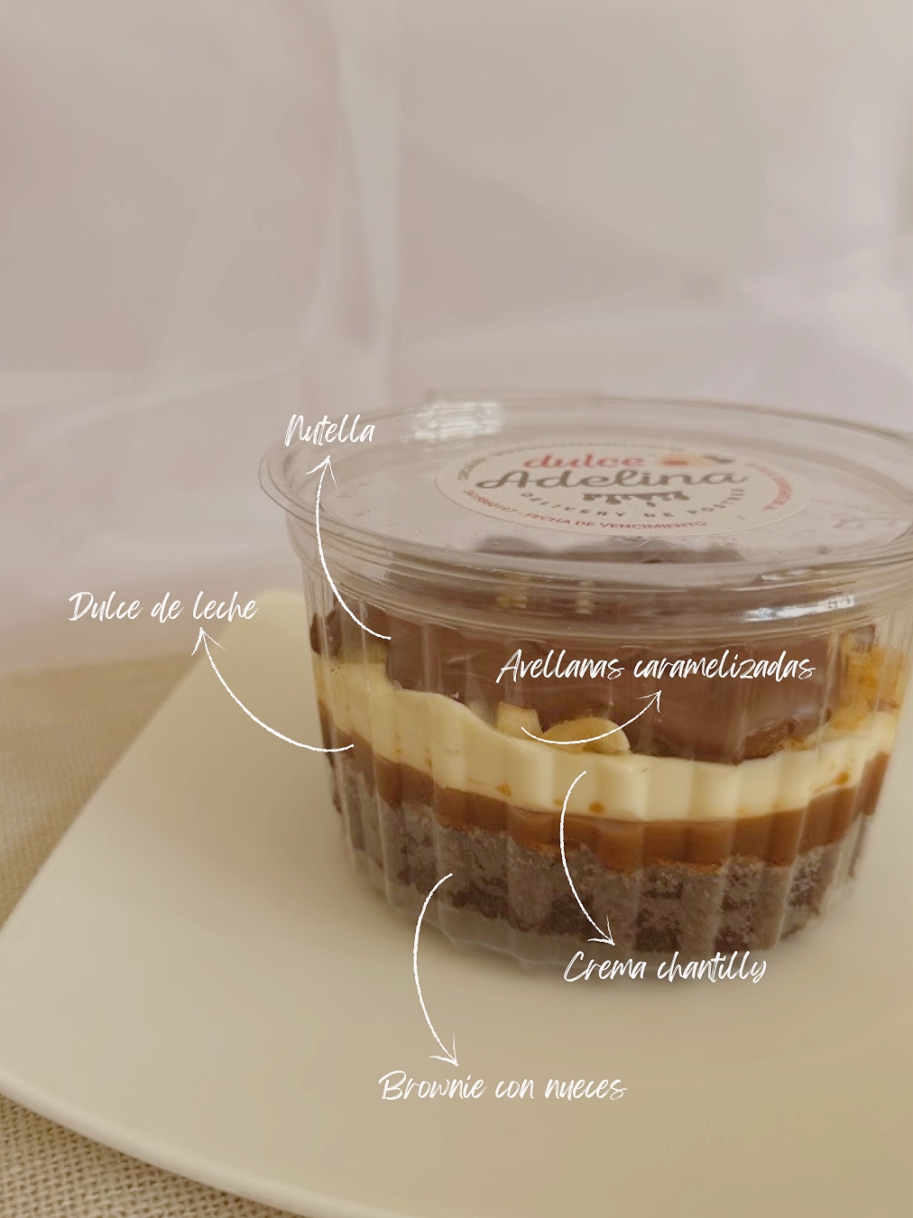 Base de brownie, dulce de leche, crema chantilly, avellanas caramelizadas y Nutella
